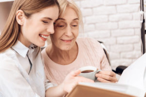 Girl is nursing elderly woman at home. They are looking at photos in photo album. February 10, 2019 by admin